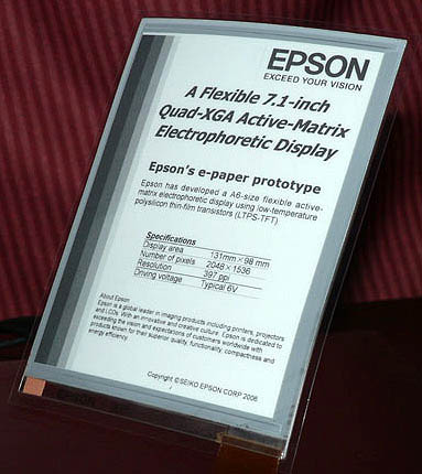 En enero de 2007, Seiko Epson Corporation informó del lanzamiento a nivel mundial de un nuevo tipo de papel electrónico con la resolución mas alta del mundo. Se trata de un soporte de tamaņo A6 (10,5 x 14,8 cm, 18 cm de diagonal) con sólo 0,47 mm. de espesor.
