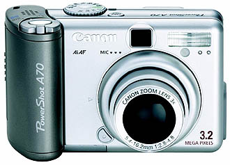La Canon PowerShot A70 combina facilidad de uso, con la innovadora tecnología "DIGiC" desarrollada por Canon, que mejora significativamente la calidad e incrementa la velocidad. Esta cámara además brinda una alta resolución gracias a su zoom óptico de gran nitidez de 3x y 10x combinado y su poderoso sensor CCD de 3.2 megapíxeles.